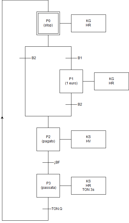- per semplificare il problema il comando della sbarra è affidato solo ai due segnali KS e KG (senza finecorsa e stati intermedi): la sbarra è giù se KG vale 1 ed è su se KS vale 1; in ogni passo bisogna indicare quale comando tra i due è attivo