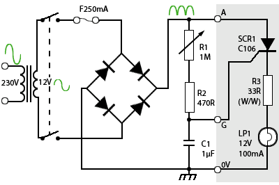 Il ramo con la resistenza variabile e il condensatore permette di innescare l'SCR nel momento desiderato (aumentando la R la carica del condensatore rallenta e l'innesco avviene più tardi); il diodo fa sì che la tensione sul gate sia solo positiva.