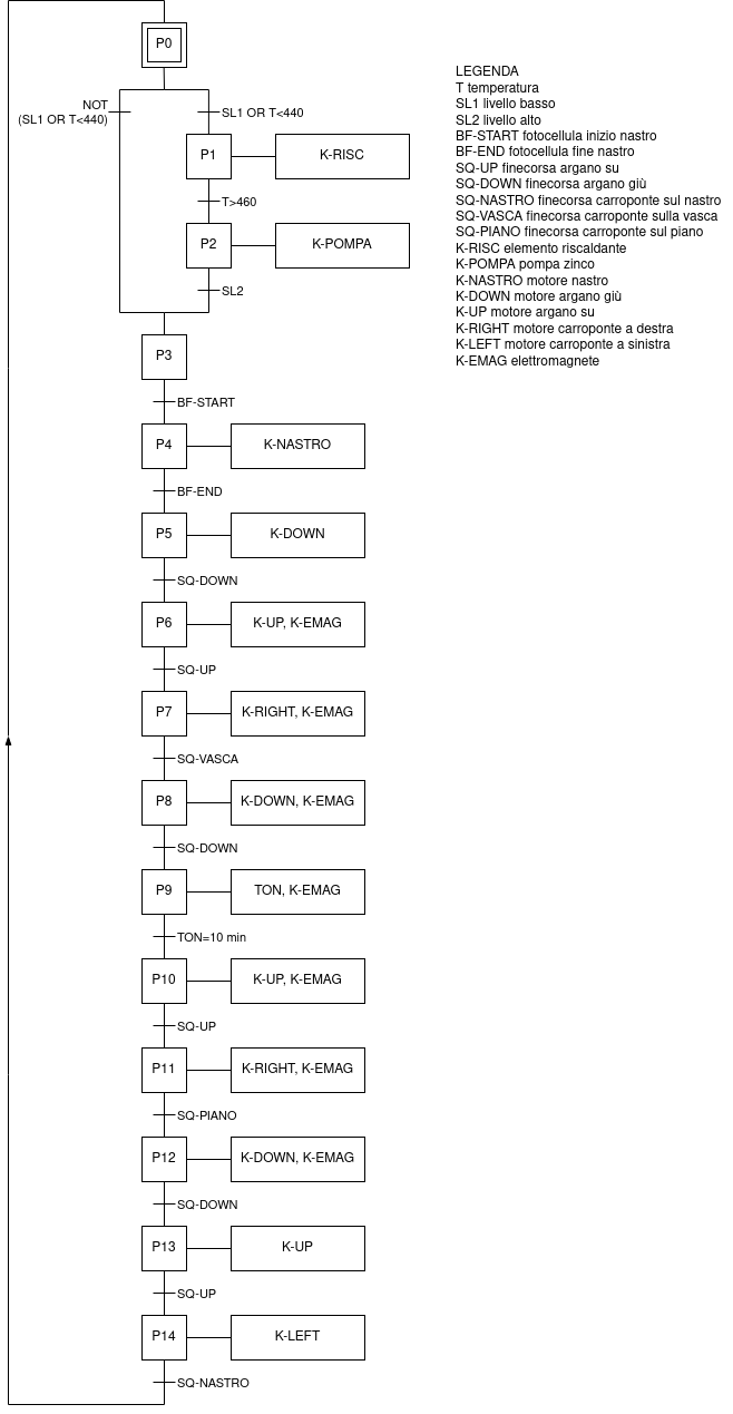 L'algoritmo non è complicato e il funzionamento è completamente automatico. L'unica variazione da prevedere nella sequenza è per gestire il livello e la temperatura nella vasca. Si potrebbe ricorrere al parallelismo ma in realtà non sono due controlli completamente indipendenti (si può pompare lo zinco se non è liquido?) quindi tanto vale gestire in sequenza temperatura e successivamente livello.