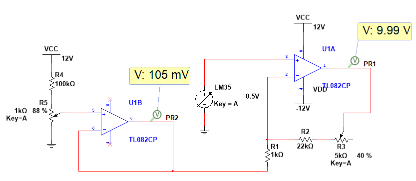 Il partitore sulla sinistra produce un valore di tensione che introduce un offeset nel segnale in uscita, altrimenti si avrebbero 0 Volt a 0°C. Il buffer evita di caricare il partitore di tensione. In questa soluzione si applica il principio di sovrapposizione degli effetti considerando prima il solo segnale dell'LM35 - quindi una configurazione da amplificatore non invertente con 0 Volt in uscita al buffer - poi la sola tensione in uscita al buffer (configurazione da amplificatore invertente con 0 Volt in uscita al LM35).